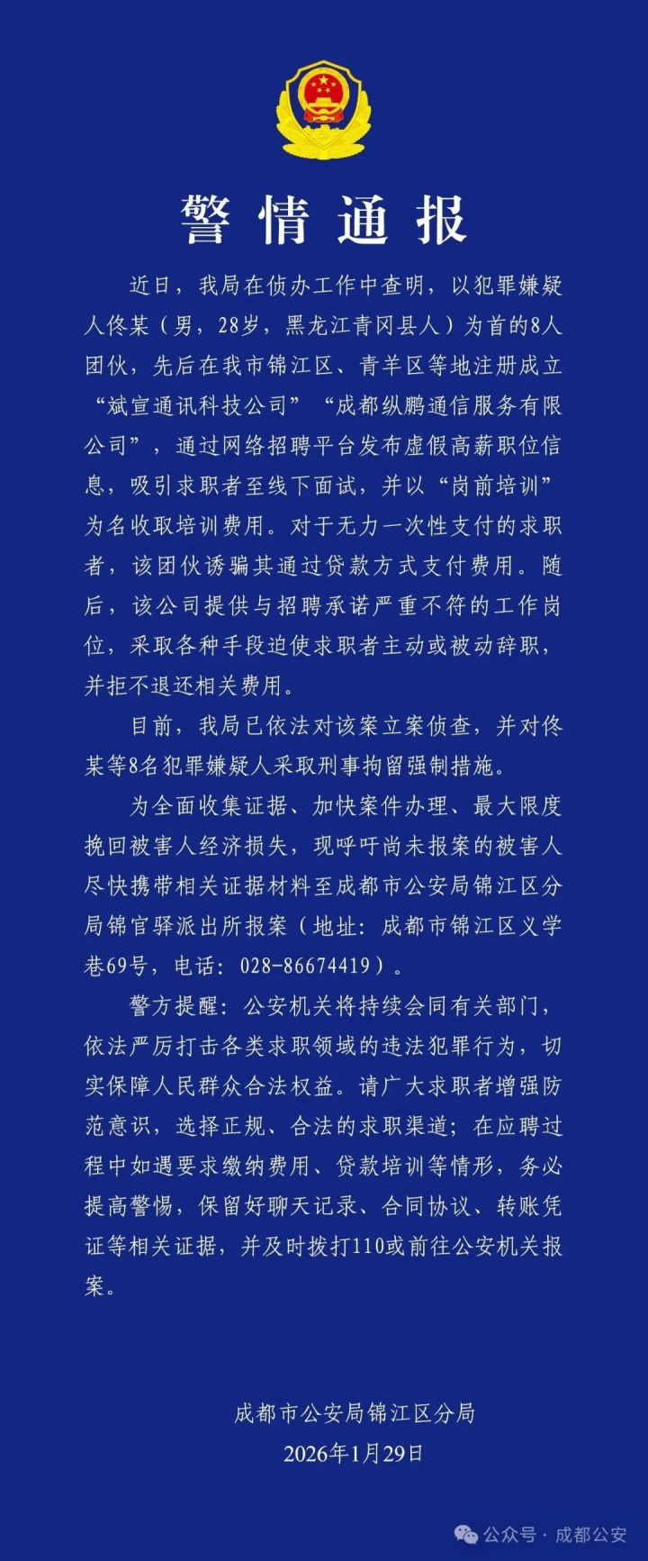 近日,我局在侦办工作中查明,以犯罪嫌疑人佟某(男,28岁,黑龙江青冈县人)为首的8人团伙,先后在我市锦江区、青羊区等地注册成立“斌宣通讯科技公司”“成都纵鹏通信服务有限公司”,通过网络招聘平台发布虚假高薪职位信息,吸引求职者至线下面试,并以“岗前培训”为名收取培训费用。对于无力一次性支付的求职者,该团伙诱骗其通过贷款方式支付费用。随后,该公司提供与招聘承诺严重不符的工作岗位,采取各种手段迫使求职者主动或被动辞职,并拒不退还相关费用。